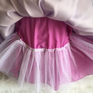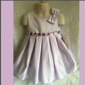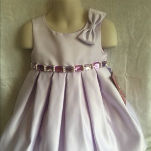 Beautiful Lilac dress. It has large purple and lavender stones adorning the high waist. Little faux pearls in between stones. Ties in back. Purchased for a wedding and never used. It has tulle underskirt for volume.