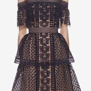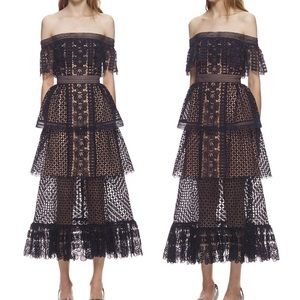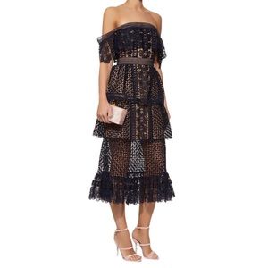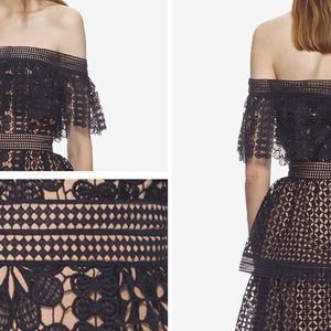 This off shoulder fit and flare style is made from navy floral guipure. The dress features statement guipure frills and is detailed with tonal lace trims throughout.