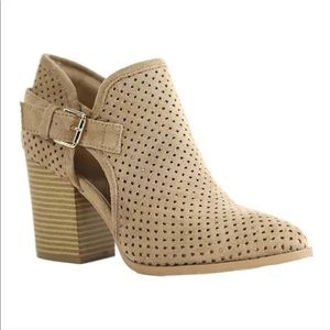 Get these beauties before they are gone! Booties are everywhere and update everything. These taupe, perforated booties have a block heel and a buckle side. The heel is 3.5 inches tall. Also available in black.