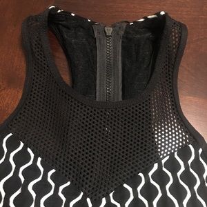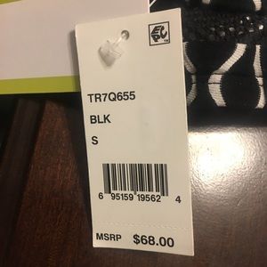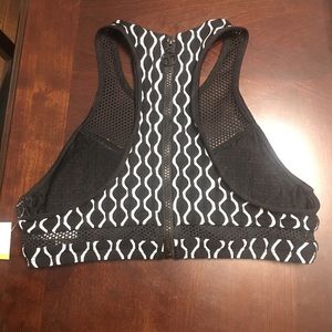 Brand new with tags! Trina Turk black and white geo print sports bra. Features mesh on the chest and around the back, and zippers in the back. Moisture wicking material. Available in size x-small or small.