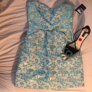Blue and iridescent embroidered floral dress with pockets and strapless-Size Medium. Really cute for any semi formal or formal occasion!