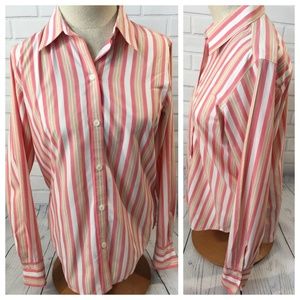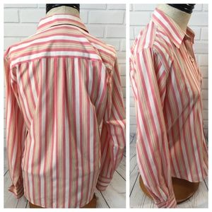 Women's size 4 non iron Liz Claiborne Liz Sport long sleeve button down shirt in the colors of white, pink and yellow stripes. 100% cotton. No flaws noted except hole in tag.