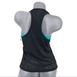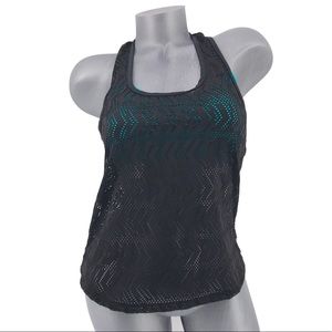 Go by Gossip 2 piece black and teal tankini set. Racerback bikini top underneath with laser cut tank top overlay. Both pieces can be worn separately or together.