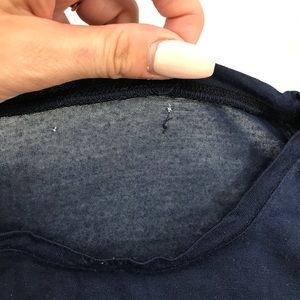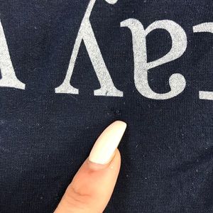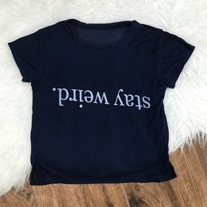 Brandy Melville women's "stay weird" navy blue crop top. Short sleeve crew neck tee. Great used condition- one small snag (see photo) and the Brandy tag came off and left a small hole in the back (photo). One size