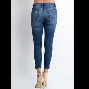 Destructed Skinny Jeans with Ankle Slits. 92% cotton 6% polyester 2% spandex. Dark Medium wash. These jeans have destruction and distress on the front of the jeans and on the back pockets. These skinny jeans feature a 5-pocket design with all pockets being functional. 27” inseam & 7.5” front rise. These have a good stretch and runs a tad big, recommend sizing one size down
