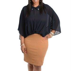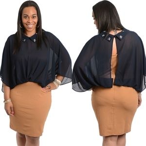 This Two-tone unique dress features a poncho style with collared neck blouson style top with jeweled collars. Slit back accent and Slim pencil skirt bottom.