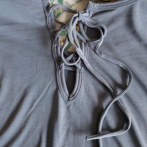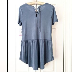 NWT, mote, Blue T Shirt Top, S, Modern Silhouette, Peplum, Lace up Back with Tie
