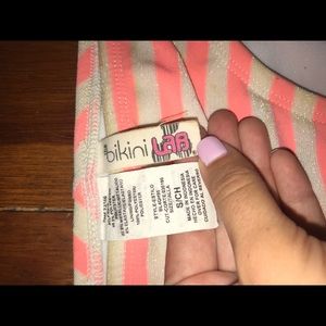 Pink and shimmery white striped bikini. Top is size medium, bottom is size small. Brand: bikini lab. I loved this bikini but I’ve outgrown the top.