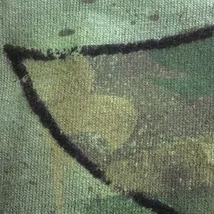 Green Tony Hawk tee with camouflage logo. Outline of the Hawk is like a flocked velvet. Purposely made to look worn away in some areas.