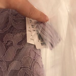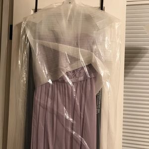 NWT David’s Bridal F18095, Lace and Mesh Long Strapless Dress, in Iris, size 4, brand new, never worn, unaltered, stored in original bag with tags still on. Bought as a bridesmaid dress for a wedding and missed the store return window. Fits true to size, I’m 5’4 and would’ve needed it hemmed. Actual color is more on the warmer side like the photos I took of the dress in the bag but the lighting was also on the yellow side so could be a little cooler in different lighting.