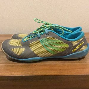 Merrell bright turquoise and lime Vibram sole tennis shoe, gently worn...I just need more support. Size 9.5