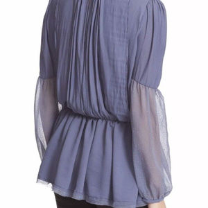 Sheer bell sleeves with subtle dotted detail, raw hem.