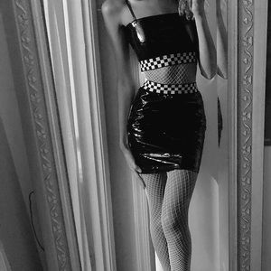 Brand new xs/small set, a checkered spaghetti strap top & a bodycon skirt, both have elastic bands and are made of shiny, stretcy material! Pair with fishnet stockings