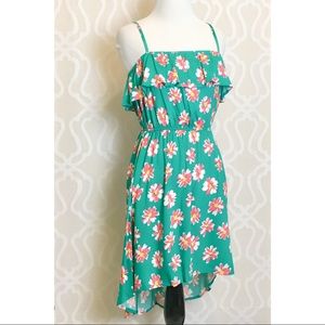 Garden Green Fabric w/Pink Flowers, Adjustable Straps, Elastic Ruffle Chest, Elastic Waist, Hi-Lo Hem.