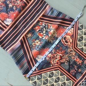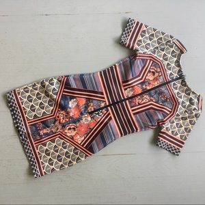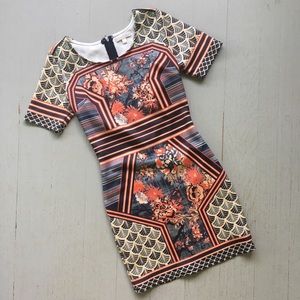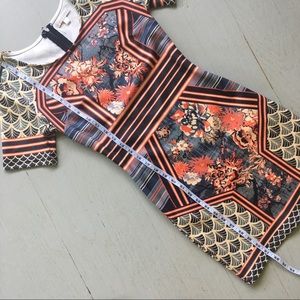 This floral and multi-printed bodycon dress has a plethora of pretty details. It has plenty of stretch to it, but the dress retains its shape well. Nice thick fabric. Zipper runs down the back. Worn twice, smoke-free home. Sexy yet conservative. Great for a girls night out or date night.