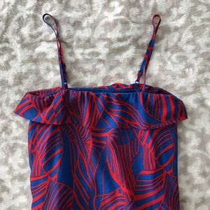 Full length maxi perfect for vacation date night or summer event. Sheer tropical print (with cotton lining). Ruffle detail at neck & adjustable spaghetti straps. The elastic neckline allows for going strapless. Universally flattering A-line shape with float away fit. Pair with sandals & your fave denim jacket or strappy heels & statement necklace!