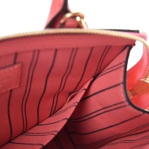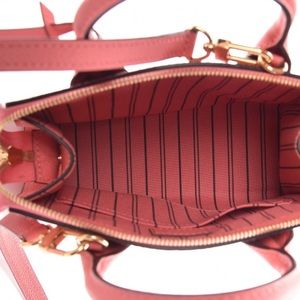 authentic Empreinte Pont Neuf bag. This small stylish tote is crafted of Louis Vuitton monogram embossed leather in a shade of coral pink with black edging detail. The bag features rolled leather top handles and silver hardware, clochette and a optional adjustable shoulder strap. This bag has a hidden front zipper pocket and the top zipper opens to a striped matching fabric interior with a zipper pocket. This bag has room for your daytime or evening necessities with the one of a kind style.