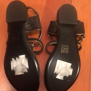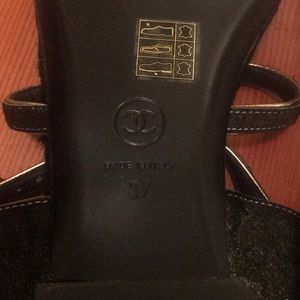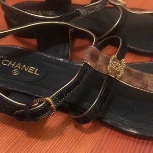 Authentic Chanel sandals/flip flops. Amazing leopard print calf hair front, straps and sides are black calf hair with gold trim. Gold CC’s on front and matching gold buckle. Excellent unworn condition, size 37.
