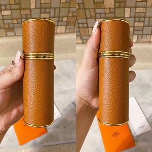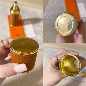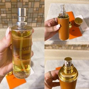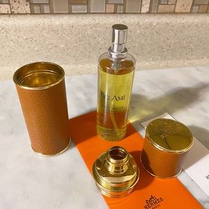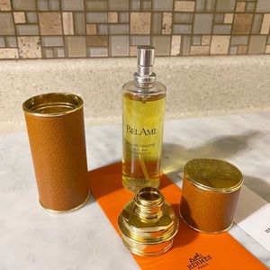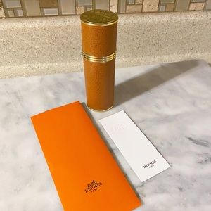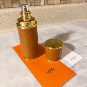 Auth. Hermes Gold Refillable Taurillon Leather Case. Absolutely Gorgeous! A refillable leather toillette Case w’ shiny gold hardware, a twist off cap & hollow gold interior for housing Hermes P-A-R-F-U-M. This one includes a free 2.5 fl oz bottle of Belami. Beautiful craftsmanship. In preowned condition -minor signs of use like scratches/dents / wear to the gold top & bottom, minor wear to the interior. The case is refillable -all pictured accessories are included. Message for further details.