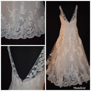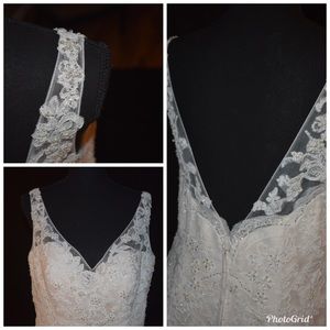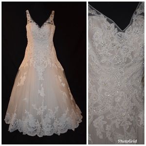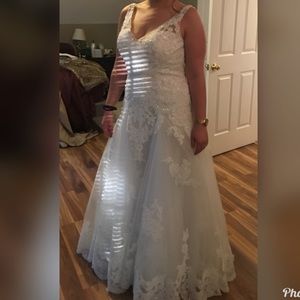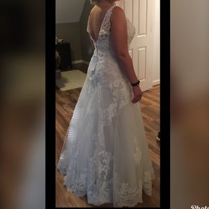 Never worn! Never altered! Brand new, tags still attached. This is bridal dress size 16 (my normal dress size is 10 to put it in perspective) and I was going to need to have only a few alterations done to make it fit snug. The color is champagne. There are small pearls as sparkly beads all throughout the lace, lots of beautiful beading up top. The lace at the bottom is so gorgeous. I love this dress, I just fell in love with another style for my body. I want to find someone who loves it as I do!
