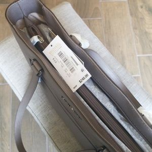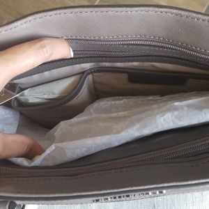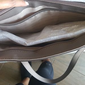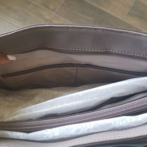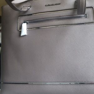 Brand New Michael Kors Tote. Absolutely love this bag. Has a beautiful gunmetal colored line around front zipper and all around the bottom of the bag. Inside has 2 compartments separated by a middle zippered compartment so 3 total. Insides have pockets.
