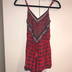 Romper with tie waist makes it adjustable. V neck in front and back. Very cute and has adjustable straps! Open to offers!