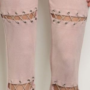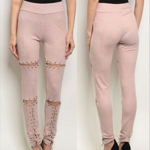 SASSY BLUSH LACE UP DETAILED SKINNY PANTS IN SOFT SUEDE LIKE MATERIAL.