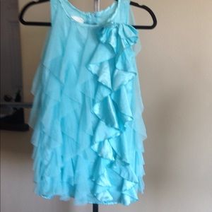 Ruffles upon ruffles with a satin bow at left shoulder. Satin underlay with tulle overlay in a very pretty Teal/Aqua color. In very nice condition. LMK if you have any questions. Feel free to make an offer.