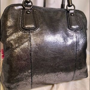 A unique gorgeous limited edition gunmetal metallic crackle leather with elegant pleats and light gunmetal/silver and black studs, Gunmetal hardware, Handle drop 8 1/2''