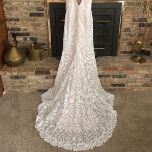 Ashley and Justin bridal gown, size 10. I typically wear a 2 or 4, and it fits quite well on me. Never worn, never been altered. Feel free to ask for more pics! http://ashleyjustinbride.com/#/dress-details/10495