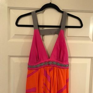 This beautiful and fun Tibi gown is so perfect for summer time! Worn once! Hemmed a little - I am 5’6 and wore 3” heals and it was perfect!