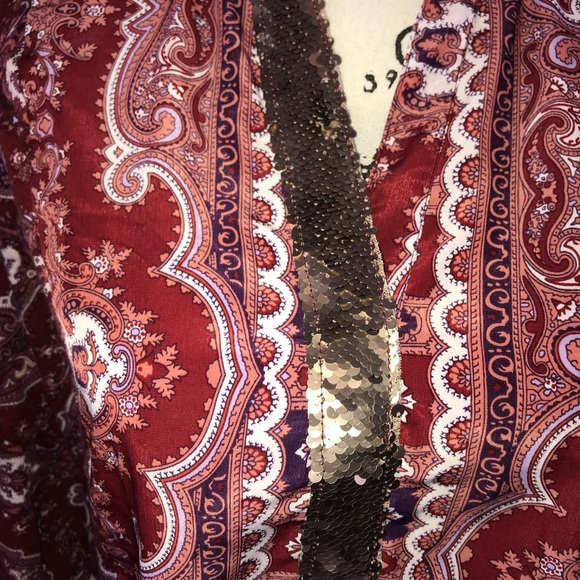 GUC due to a very small amount of pilling under arms. V neck. Burgundy Paisley. The front is rayon and the back is cotton. Long sleeves that roll up to be 3/4 sleeves.