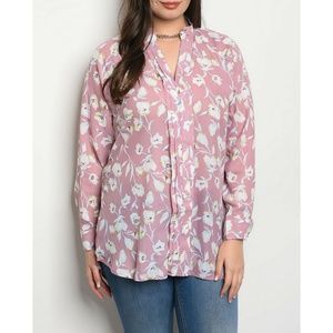 Plus size long sleeve floral print blouse that features a collard neckline.