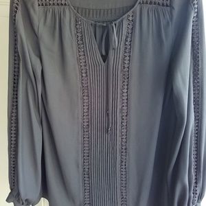 Black blouse with eyelet cutouts down the sleeves and around the neckline with bow. Eyelet down the front has a sheer backing.