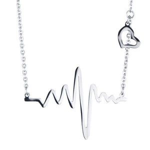 A delicate laser cut silver tone heart beat necklace is great for the rock' n roll style. The necklace is 16" length.