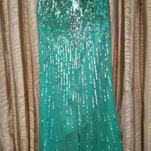 Size 8. Teal green, one shoulder formal dress with high front slit. Embellished with gold, silver, teal green sequins and gold beads. Side zipper with hook and eye for closure and support. The bust measures 32", waist is 24", hips are 32", shoulder to hem is 70 inches, the slit is 31". Made in China. The shell is 100% silk, the lining is 100% polyester. Professional spot clean only. Sherri Hill.
