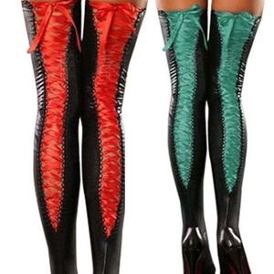 Sexy Black & Pink Lace up and Faux Leather Stretch Thigh High Stockings NWT Low and Fast Shipping. Bow at top streach to fit Breathable, shaping beautiful and sexy, thin leg look, length is 34.6" Made of streach Pleather and Lace up and tie. We have all the Colors, Black, Blue, Purple, Pink, Red, Green