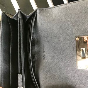 Wallet: Front lock clasp with MK gold logo, 10 card slots, 2 long slots, 1 zip, 2 open compartments