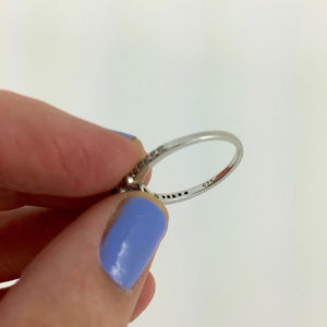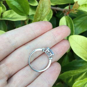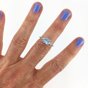 sky blue faceted topaz set into 4 sterling silver prongs + flanked by 6 white zircons on sides of the band
