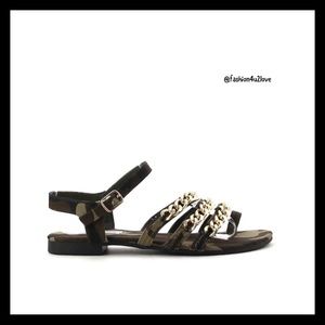 The features includes a printed fabric, strappy accent with a ring toe, high polish chain accent, slingback with an adjustable high polish adjustable buckle.