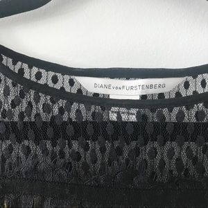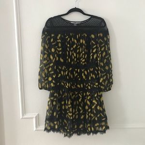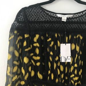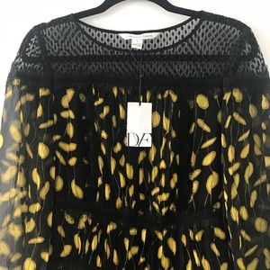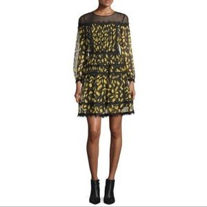 Mixed lace trim adds a hint of romance to this print silk DVF mini dress. Ruched tiers create swingy volume, and the sheer yoke reveals a peek of skin. Blouson sleeves. Hidden side zip. Lined.