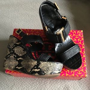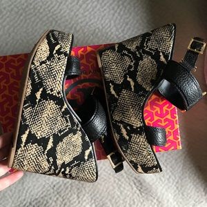 Absolutely Gorgeous Tory Burch black platforms wedges used twice! Love them, they have a snake wedge measuring 5” on the heel and 2” in the front they’re very comfortable while giving you height. EUC no damage to the wedge