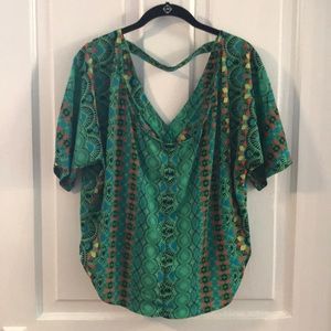 Vibrant, colorful, open-back blouse. Waist-length in front, longer in back. Button front, short-sleeve. Excellent condition. Message for more size info.