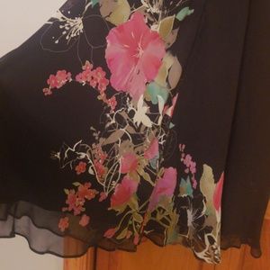 Absolute stunner of a dress! Appears unworn.100% silk shell of sheer black with floral pinks and greens.100% polyester black lining under entire dress. Gorgeous gathering around waist to shoulders that comes just slightly over the arm, snaps to hold bra in place. Back zipper is 19". This will turn the heads at any occasion! Size 6. See measurements below.