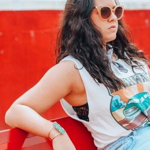 Handcrafted in a womens cooperative in India this adjustable goldstone plated brass cuff is the ultimate spring and summer accessory. Its bright retro color scheme brings the best western festival vibes to your accessory collection.