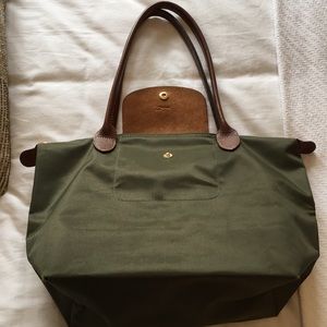 Longchamp Le Pliage Small Nylon Tote Bag in Longchamp’s “Khaki” color. Excellent condition. Authentic. Only light wear on bottom corners. Like new! Black on the inside with no visible wear. Small khaki pocket on the inside, also with no visible wear. Great for Fall‼️