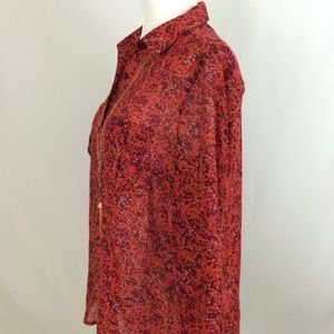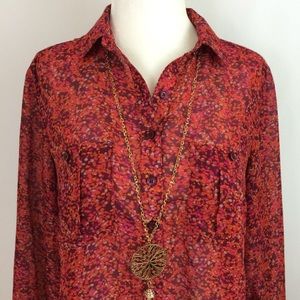 This is a light weight wine, orange, and pink print button up blouse with a round hem. It's semi-sheer and has two front pockets. It's 100% polyester. Jewelry not included.