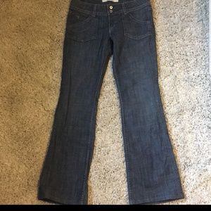 Hudson Jeans. They are low rise. Material is 98% Cotton, 2% Elastin