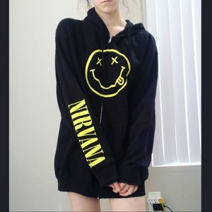really warm, zips up, no flaws. Nirvana classic. #: nirvana, kurt cobain, black and yellow, band hoodie, vintage band hoodie, band jacket, nirvana jacket,