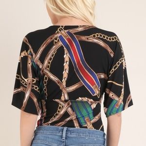 Deep V cut luxury print bodysuit. Snaps close between legs.